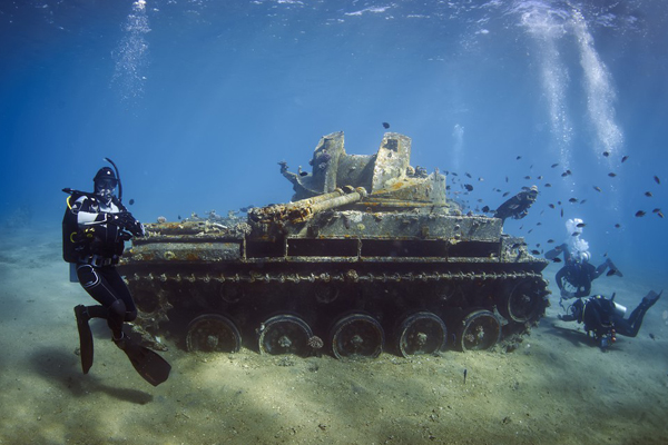 Aqaba under water military museum The worlds first underwater military museum just off the shores of Aqaba. A total of 19 pieces of hardware all in "battle formation" and includes tanks of different sizes, an ambulance, a military crane, a troop carrier, anti aircraft guns and a combat helicopter.